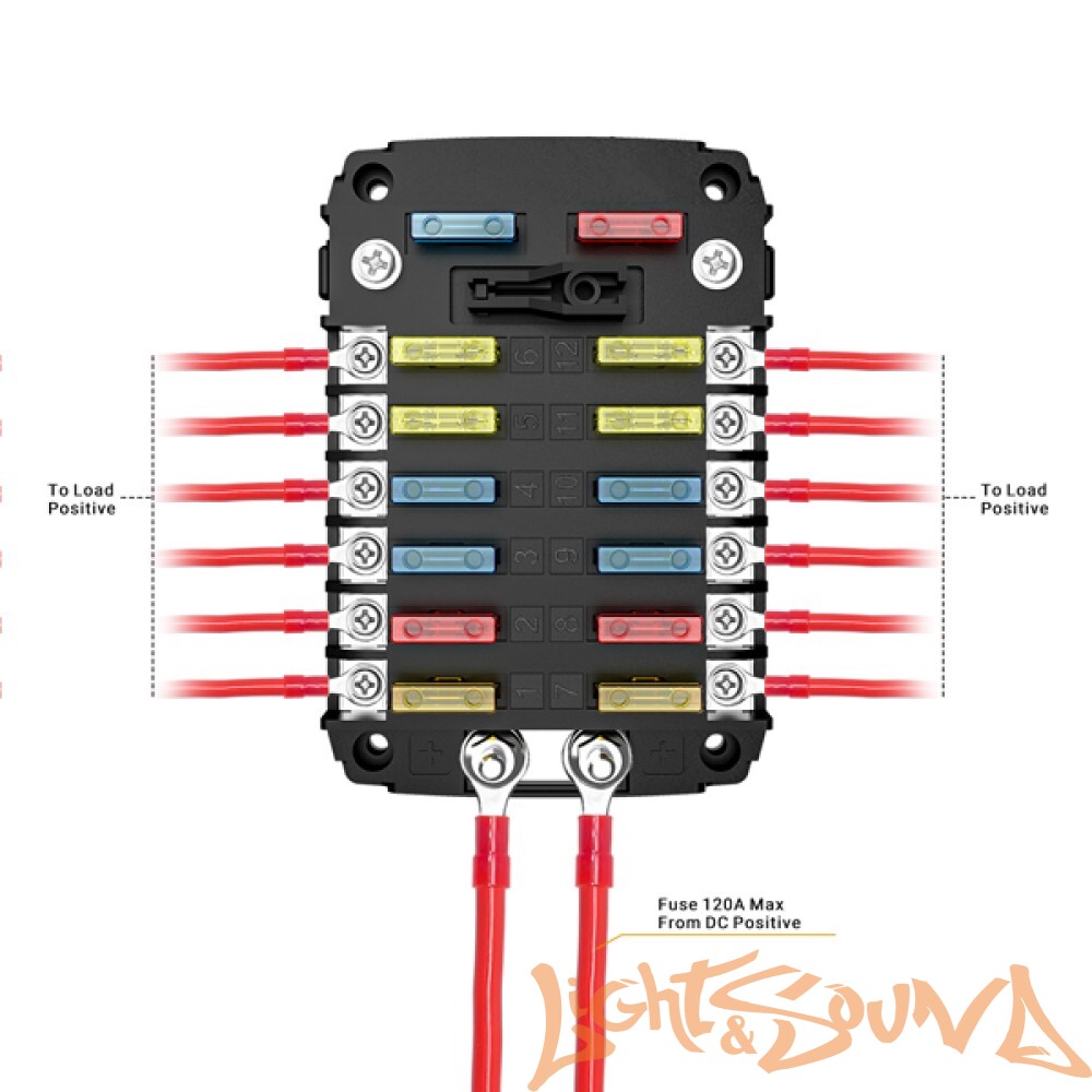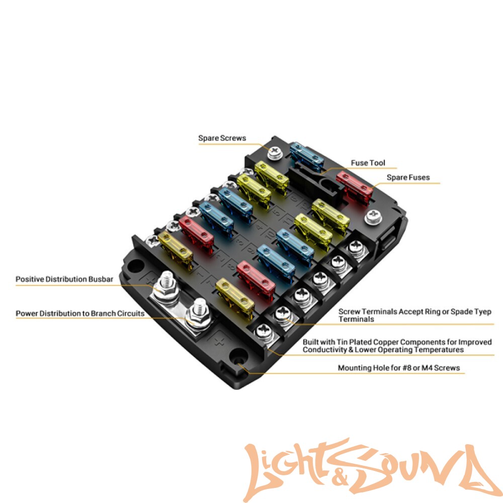 Блок предохранителей на 12 цепей принимает быстродействующие плавкие предохранители ATO® и ATC®Луженые медные шины и зажимы предохранителей для максимальной передачи мощности. Шина положительного распределения с шипами №10-32. Подходит для кольцевых или защелкивающихся вилочных клемм. Крышка из поликарбоната оснащена легко открывающейся кнопкой, обеспечивающей удобный доступ к предохранителям. В комплект входят 24 предохранителя, два запасных винта и инструмент для замены предохранителей, а также наклейки с маркировкой цепей.