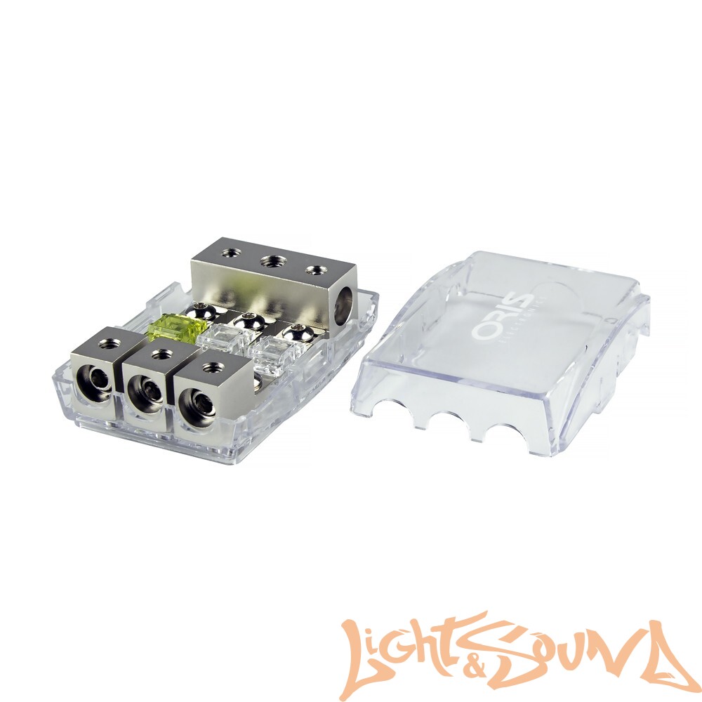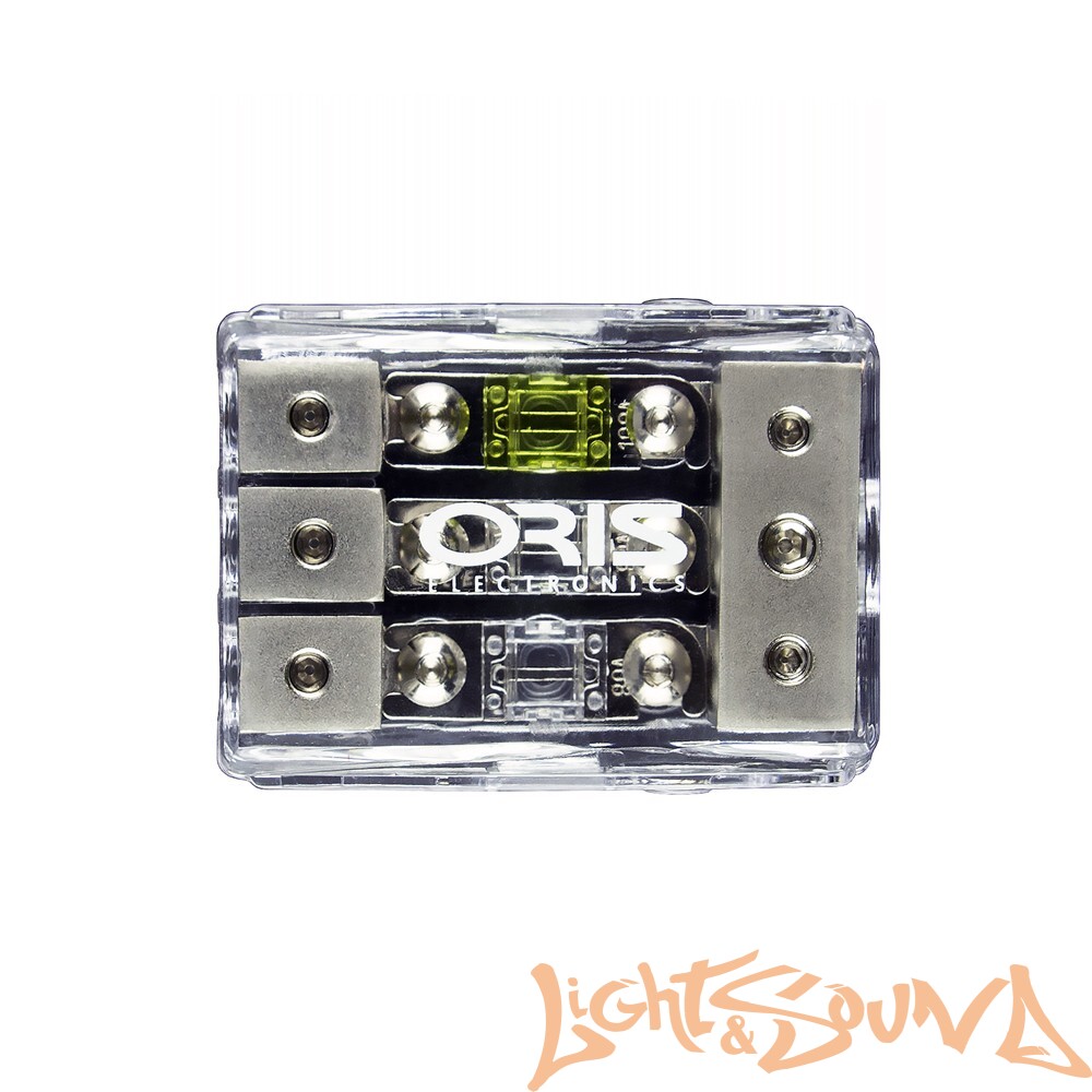 Держатель для установки 3-x предохранителей типа Mini ANL, в корпусе из термостойкого пластика, для кабелей сечением до 0Ga. В комплекте предохранители номиналом 2х80 А + 1х100 А и переходные втулки для кабеля.