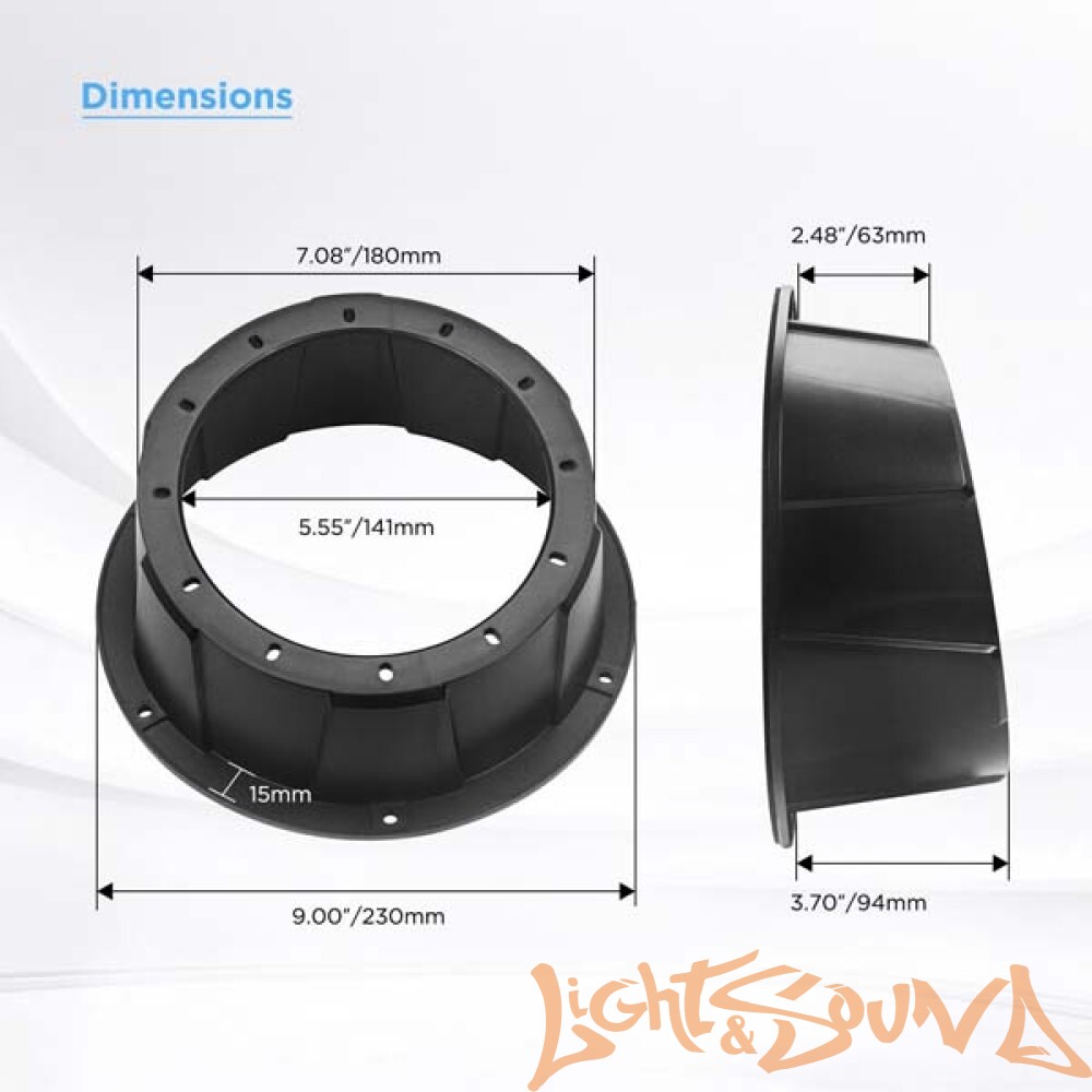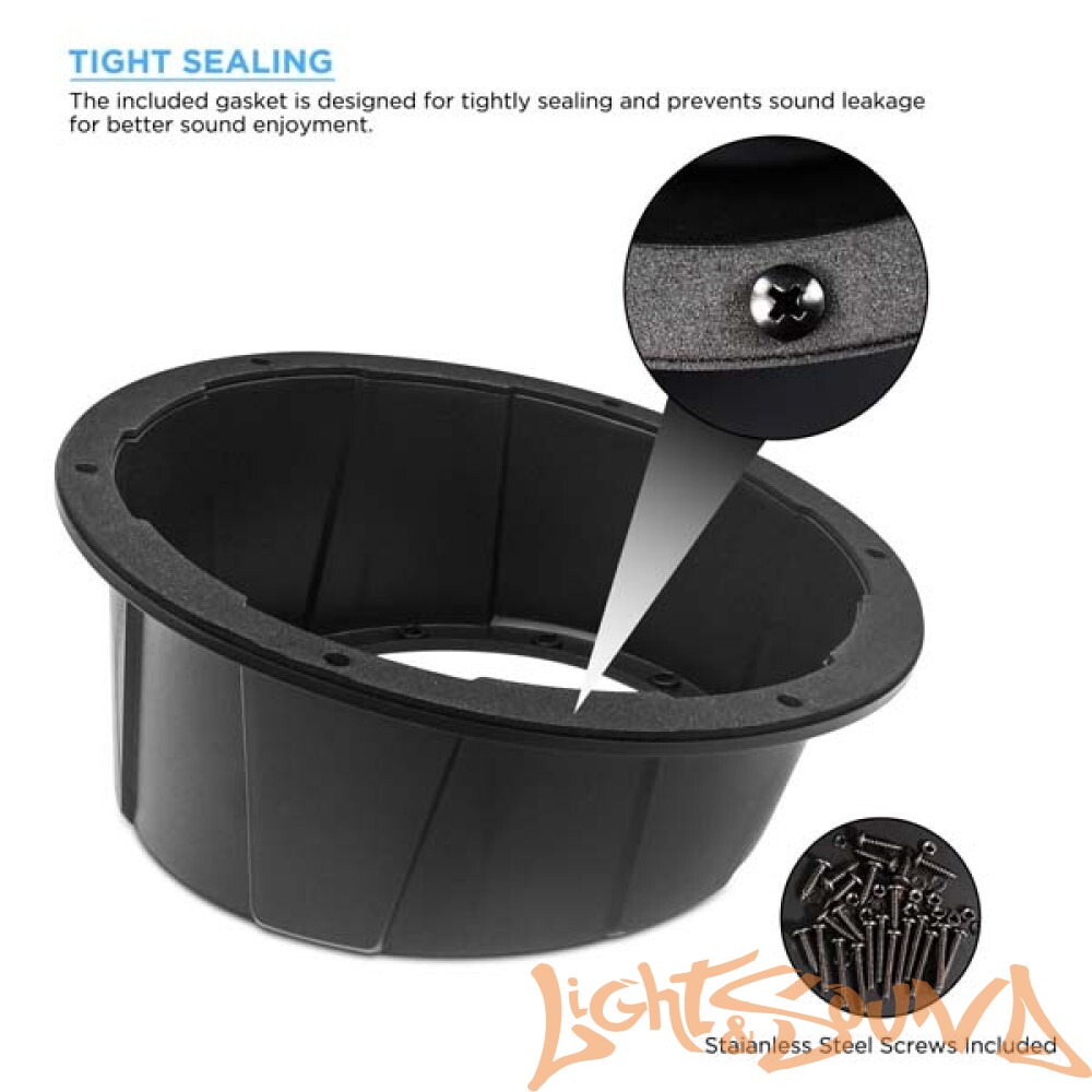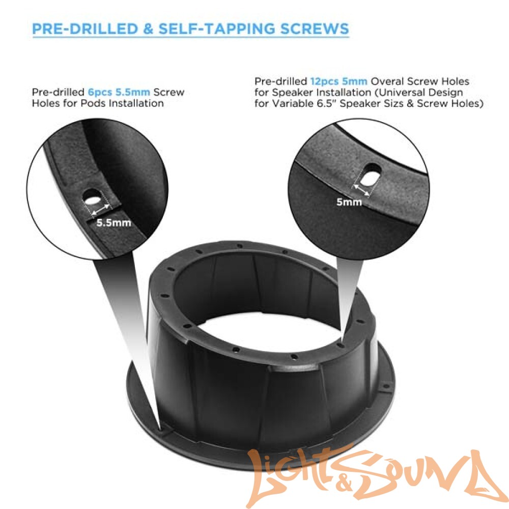 Эти без угловых корпусов динамиков поставляются с отверстиями диаметром 140 мм (5,55 дюйма) в верхней части для удобства установки. В них предварительно просверлены 12 отверстий диаметром 5 мм для установки динамиков и 6 отверстий диаметром 5,5 мм для установки модулей. В комплект входят винты из нержавеющей стали.