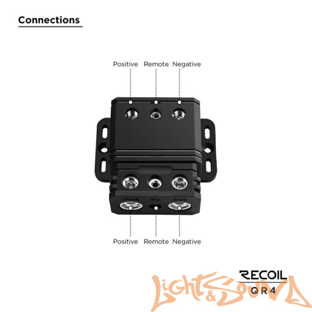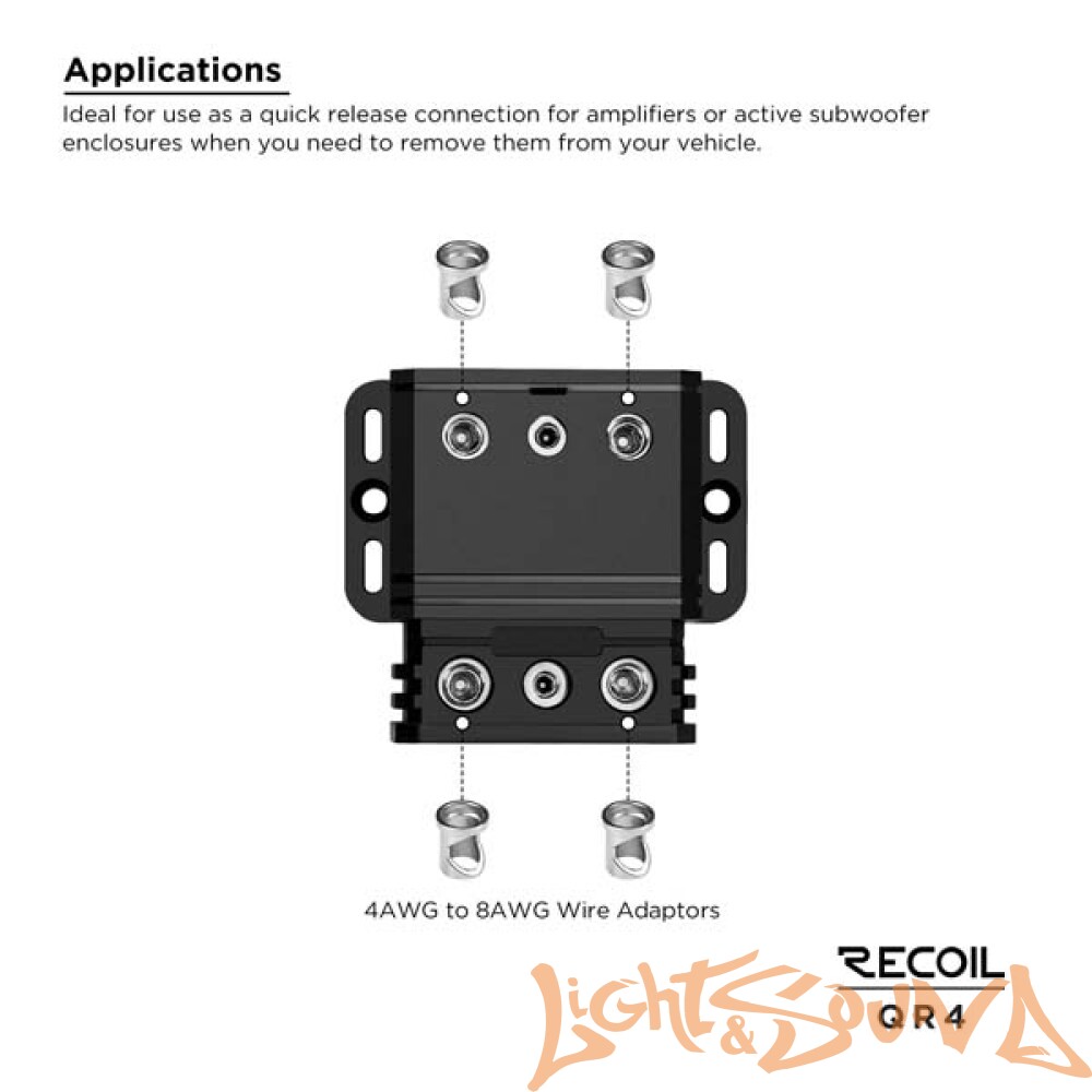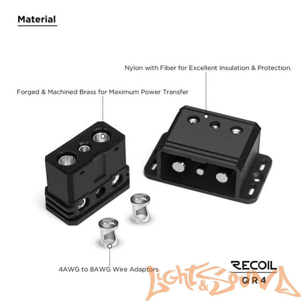 Он предназначен для приема 4 или 8 проводов AWG и способен обрабатывать аудиосистемы мощностью до 1500 Вт.