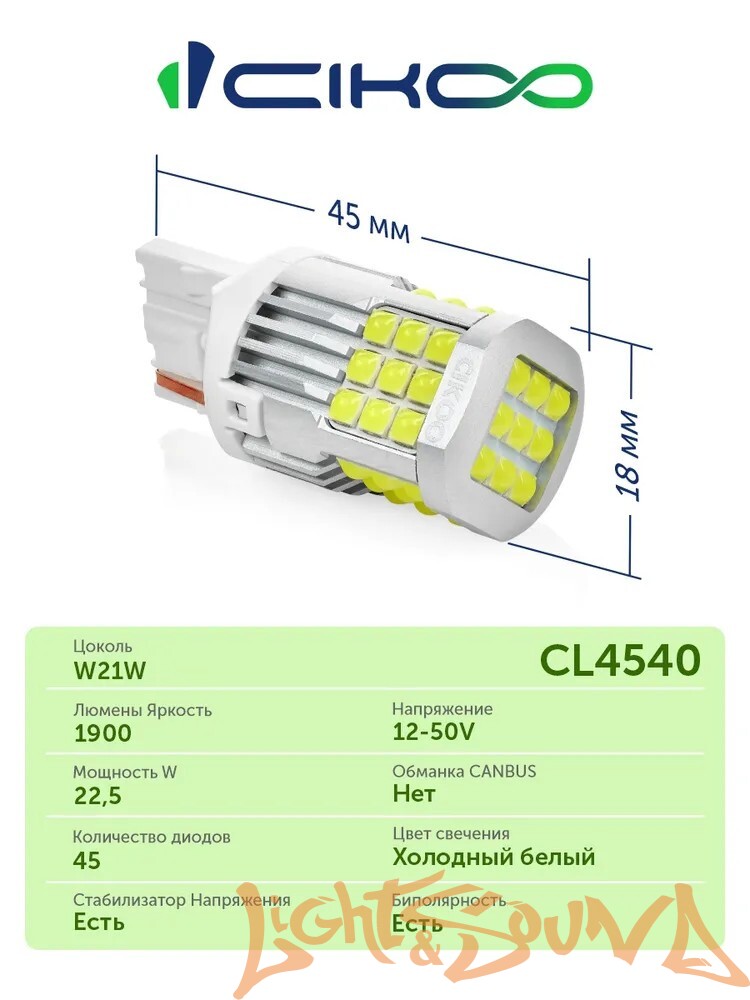 Задать вопрос о товаре: CIKOO W21W, CL4540, 12-24V, 45SMD AVIA, 1800Lm, (2шт)