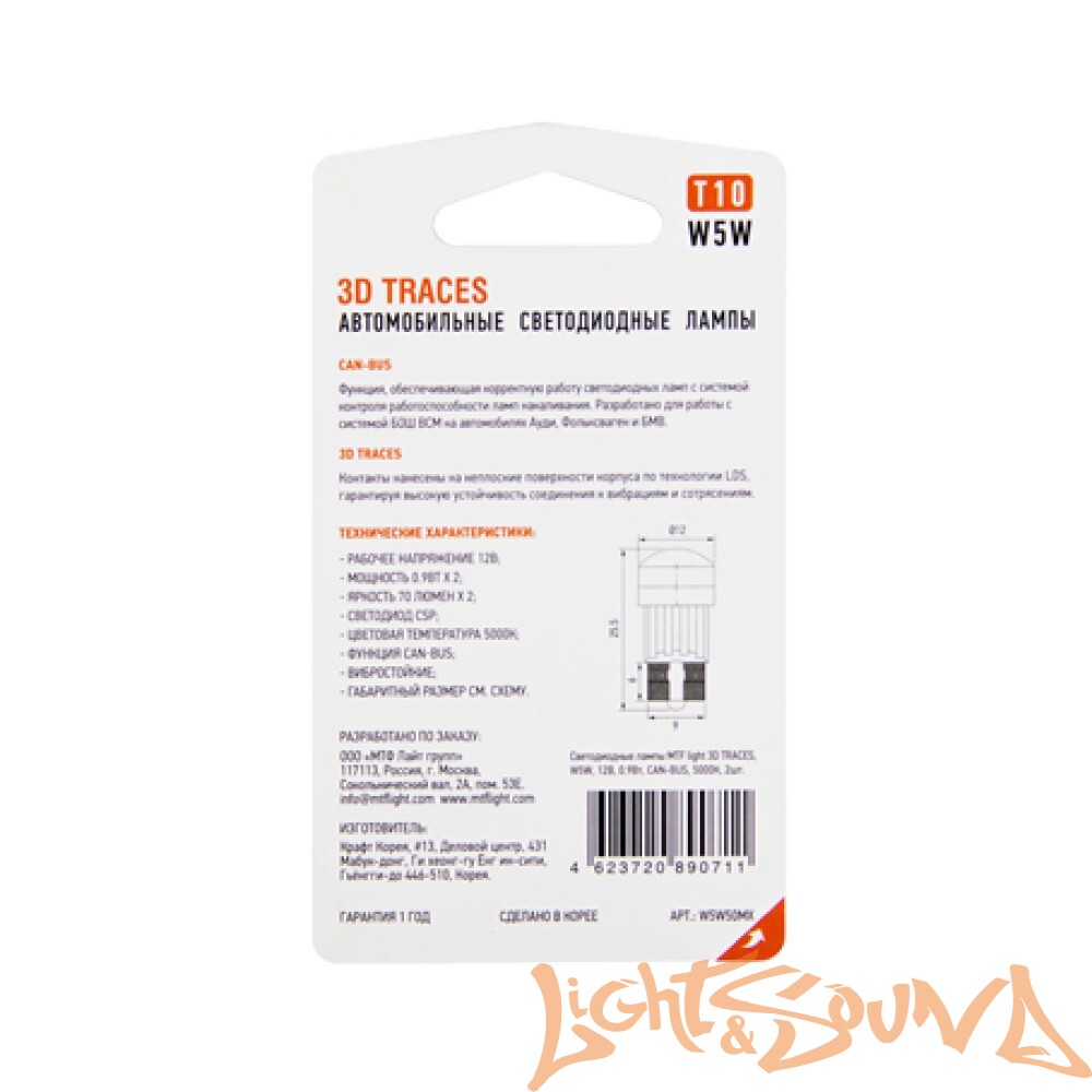 Задать вопрос о товаре: MTF Light 3D Traces W5W/T10, 5000к белый свет, 12В, 0,9Вт, CanBus, 2шт